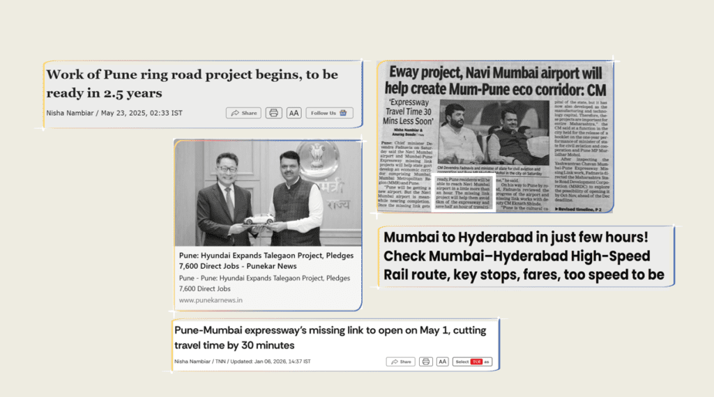 - Pune Metro expansion (≈10%) is expected to improve connectivity to emerging zones